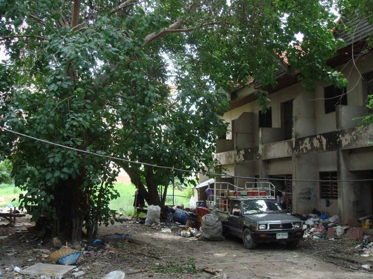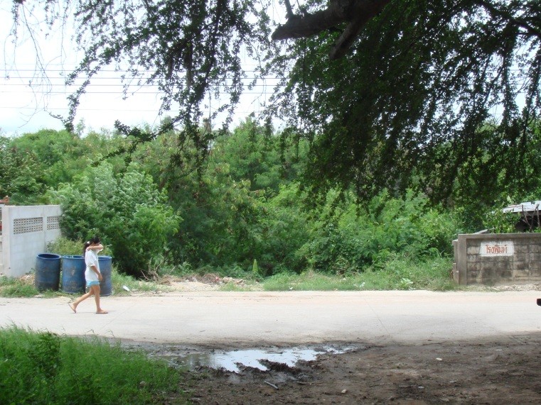ลักษณะทำเลเดิม (ภาพซ้าย) ที่เป็นทำเลที่รกร้าง สภาพแวดล้อมดูไม่เป็นมงคล อย่างไรก็ตามยังมีลักษณะบางอย่างที่ดีเช่น ลานโล่งด้านหน้า (ภาพขวา) ซึ่งเป็นตัวสะสมพลังจากทิศทางที่ดีของ “ฮวงจุ้ยที่เป็นมงคลในอนาคต”