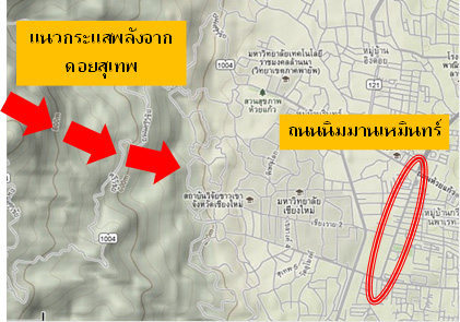 แนวกระแสพลังจากดอยสุเทพส่วนที่มีพลังมากสุด ส่งพลังไปที่ย่านถนนนิมมานเหมินทร์ และคูเมืองเชียงใหม่